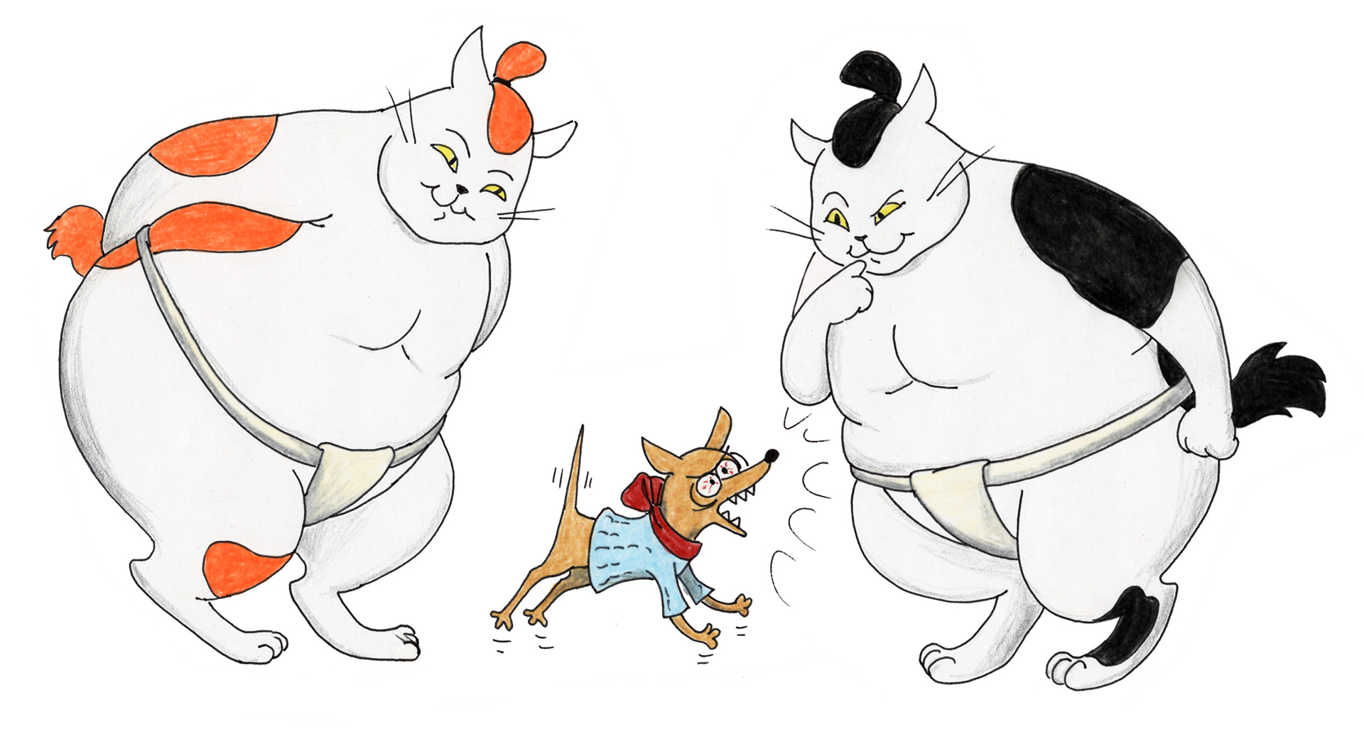 The Sumo Bros (and friends). Created as a concept for a possible animated series. Drawn in pen and colored pencil.