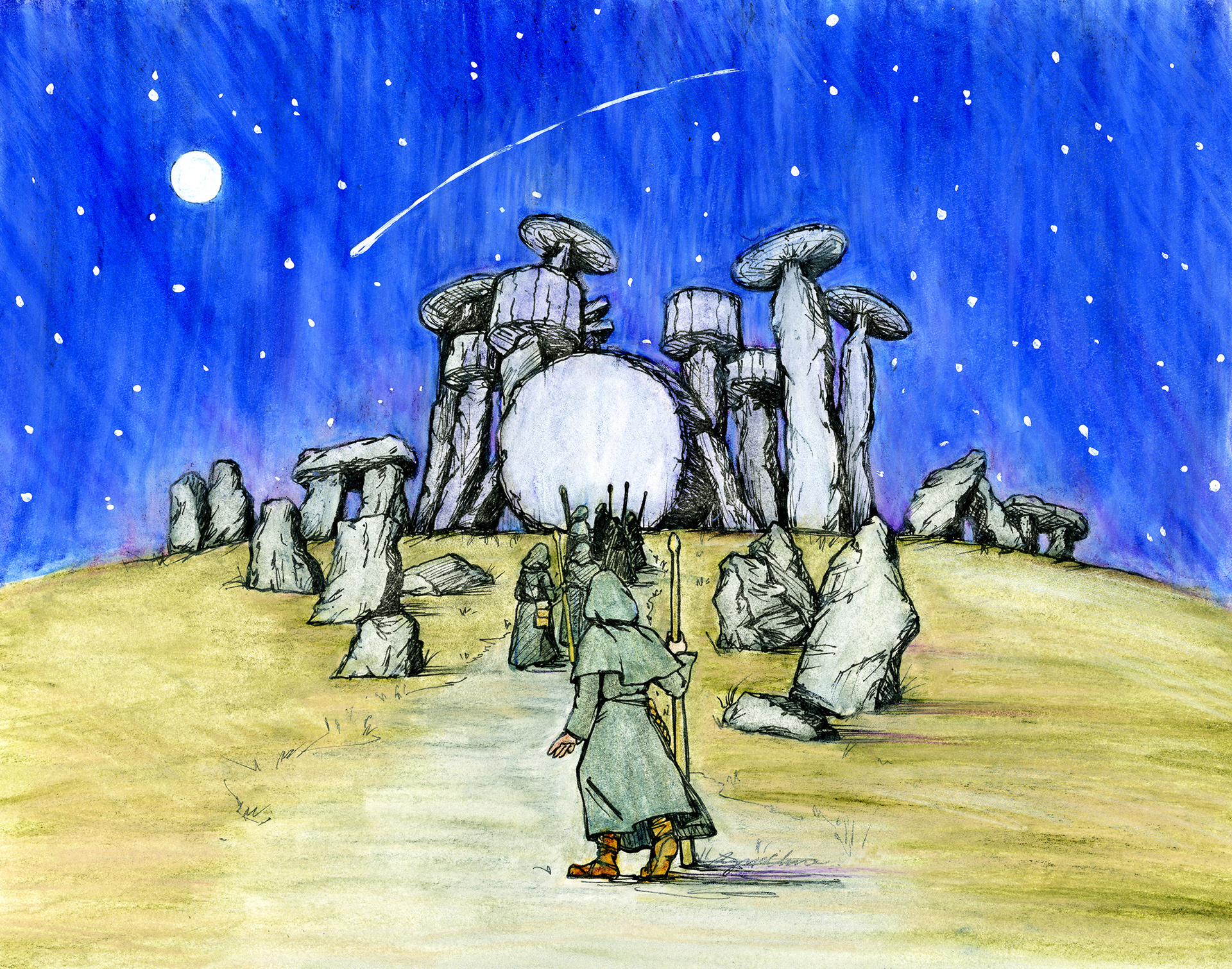 Drumhenge. Watercolor, pen, and watercolor pencil on paper. Created as a gift.