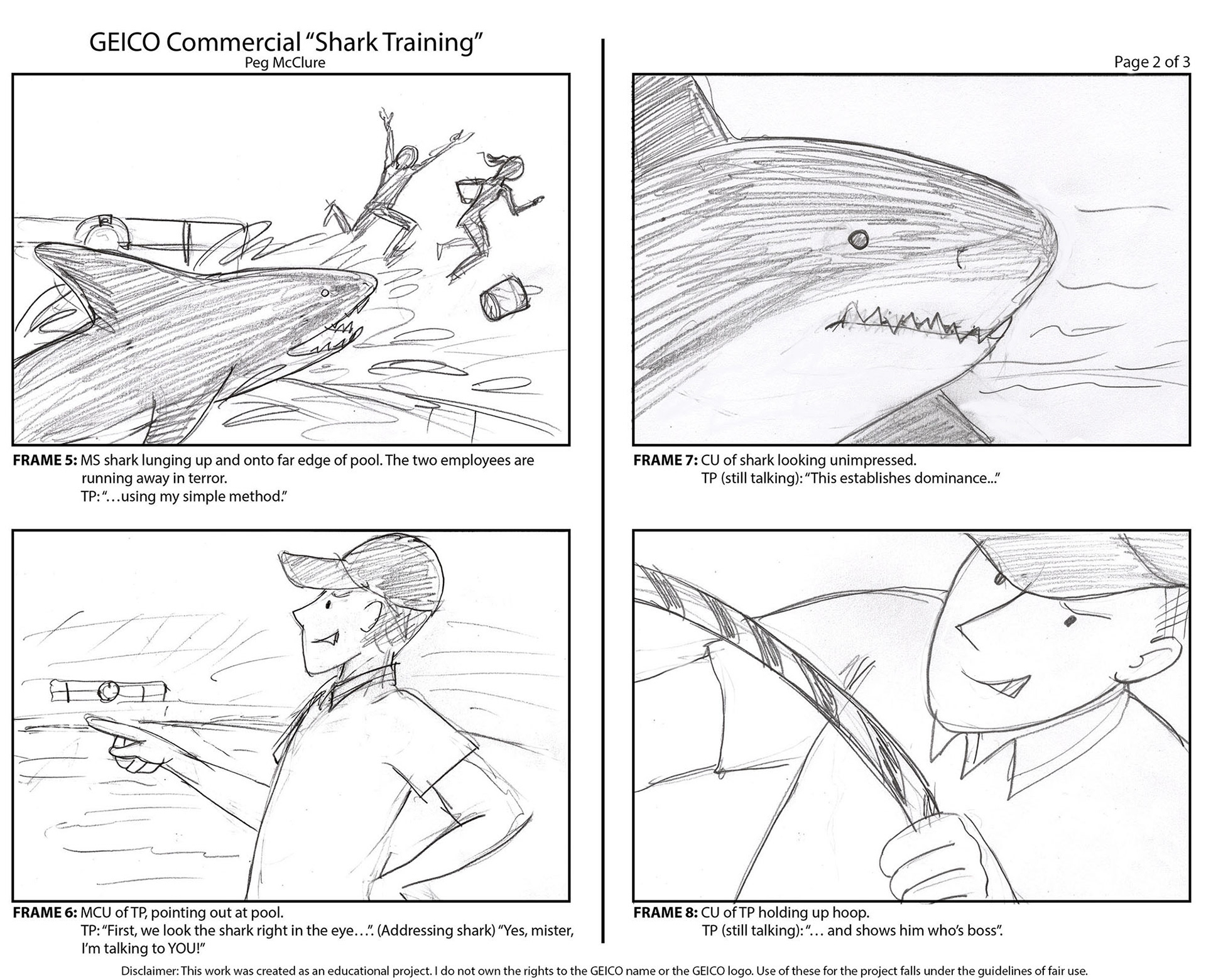 Project: "Shark Training". Create concept and 12-frame storyboard for GEICO TV commercial.